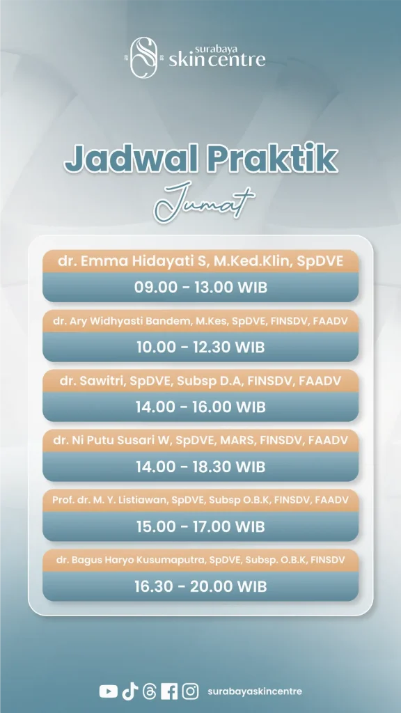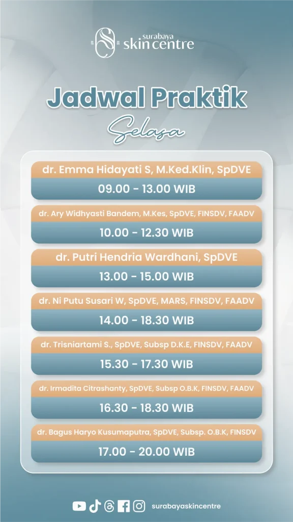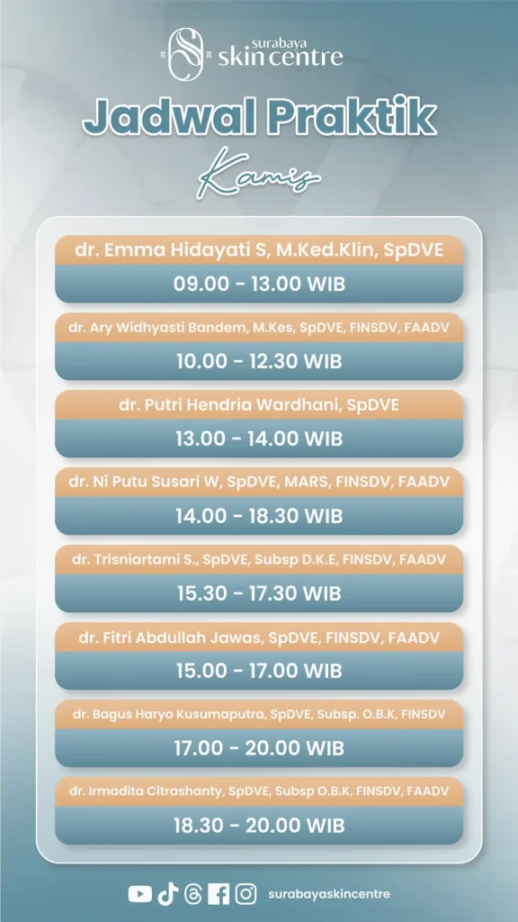 Untuk kemudahan, pasien disarankan melakukan reservasi terlebih dahulu melalui telepon atau aplikasi online agar mendapatkan waktu konsultasi sesuai kebutuhan. Layanan ini juga mencakup pemeriksaan kulit, terapi estetika, dan penanganan masalah dermatologi yang lengkap.